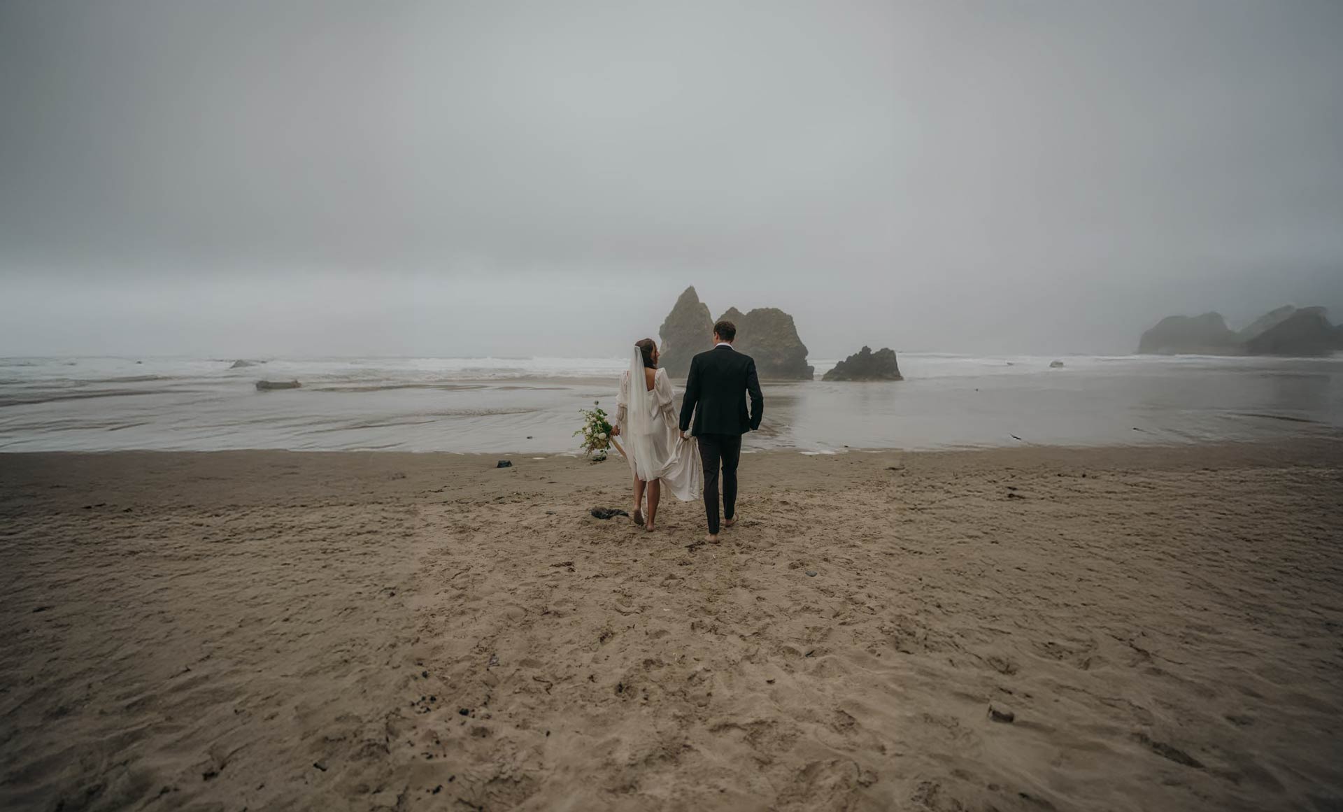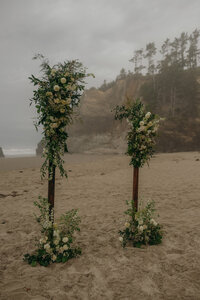 Paige and Jason embraced a misty, moody morning at Arcadia Beach on the Oregon Coast for a truly intimate elopement. With a stunning floral arch by Merry and Flora, heartfelt vows, and cinematic portraits along the shoreline, their day was raw, romantic, and completely intentional.